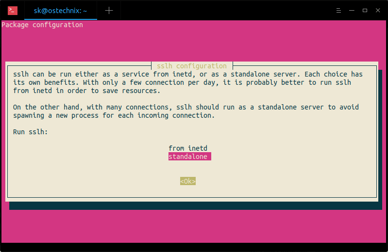 安装 SSLH 时,将提示你是要将 sslh 作为从 inetd 运行的服务,还是作为独立服务器运行。每种选择都有其自身的优点。如果每天只有少量连接,最好从 inetd 运行 sslh 以节省资源。另一方面,如果有很多连接,sslh 应作为独立服务器运行,以避免为每个传入连接生成新进程。
