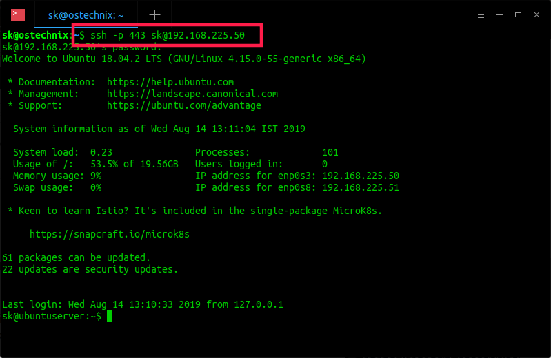 看见了吗?即使默认的 SSH 端口 22 被阻止,我现在也可以通过 SSH 访问远程服务器。正如你在上面的示例中所看到的,我使用 https 端口 443 进行 SSH 连接。