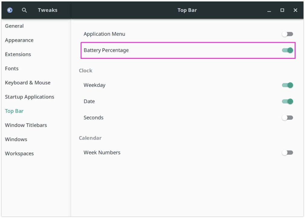启动 GNOME Tweaks » 顶部栏 » 电池百分比 ,并打开它。