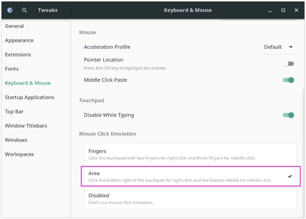 启动 GNOME Tweaks » 键盘和鼠标 » 鼠标点击硬件仿真,并选择“区域”选项。