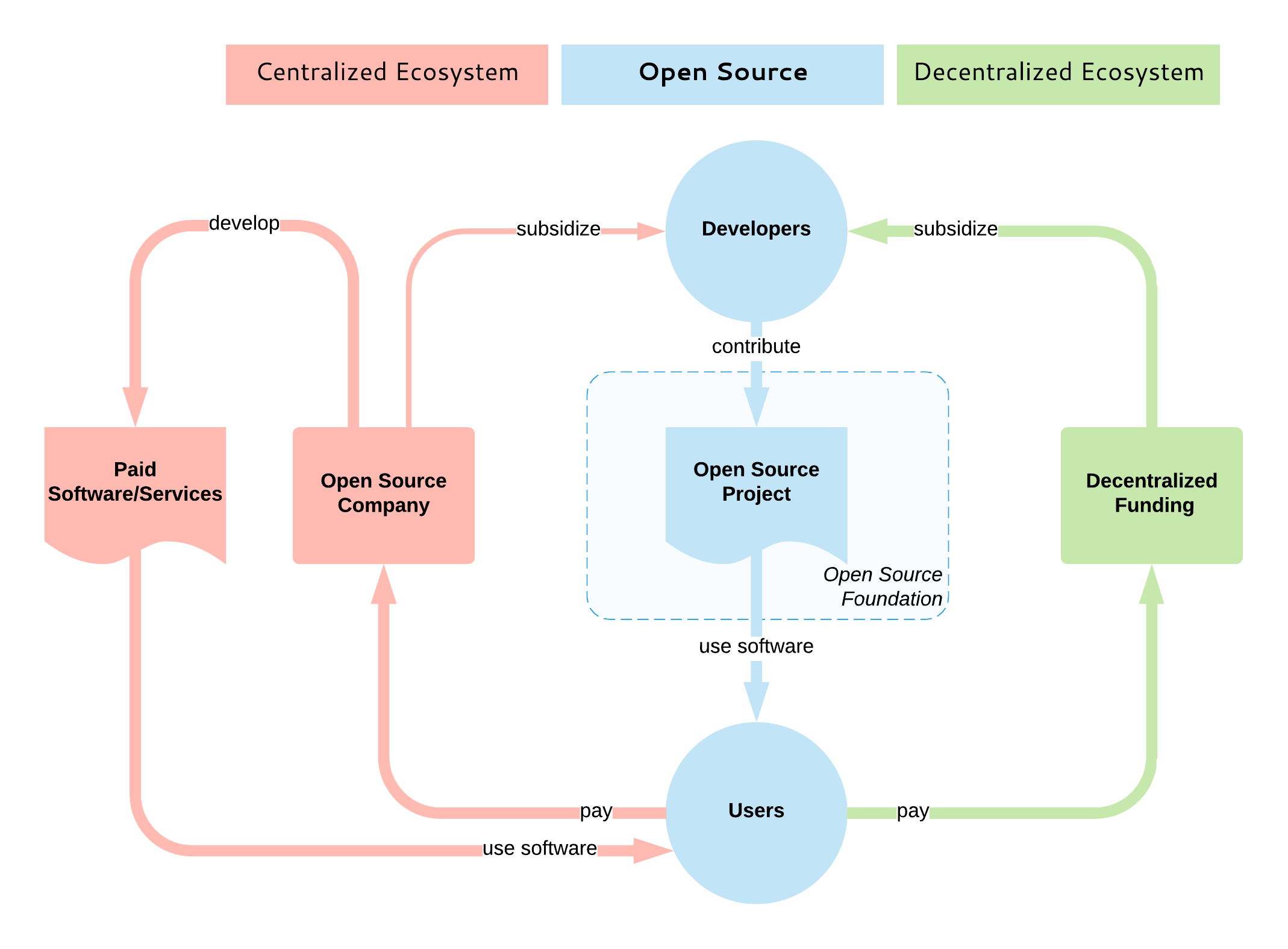 我们缺少的是一个开放的、去中心化的模式,就像一个没有集中协调和所有权的集市一样,消费者(开源用户)和生产者(开源开发者)在市场力量和开源价值的驱动下相互作用。为了补充开源,这样的模型也必须是开放和去中心化的,这就是为什么我认为区块链技术最适合的原因。