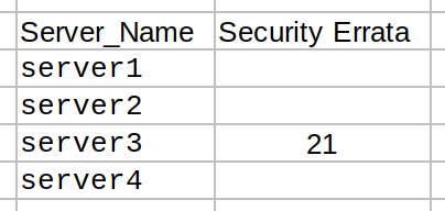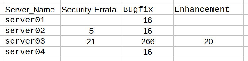 | Server_Name   |  Security Errata  | Bugfix |  Enhancement        |