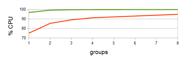 如下图的绿色曲线所示,新内核的 CPU 繁忙利用率接近 100%,作为比较的基线内核是橙色曲线: