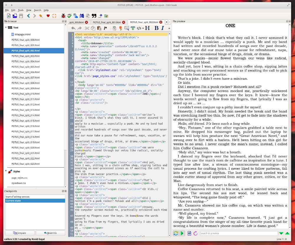 对于希望在 Amazon、Barnes&Noble、Smashwords 或其他平台上出版的任何人,Calibre 都是必备工具。Caliber 比其他类似解决方案更好地方是,它使你可以直接编辑 .epub 文件(图 4)。对于 Smashword 来说,这是绝对必要的(因为导出过程将添加 Smashwords 转换工具上不接受的元素)。