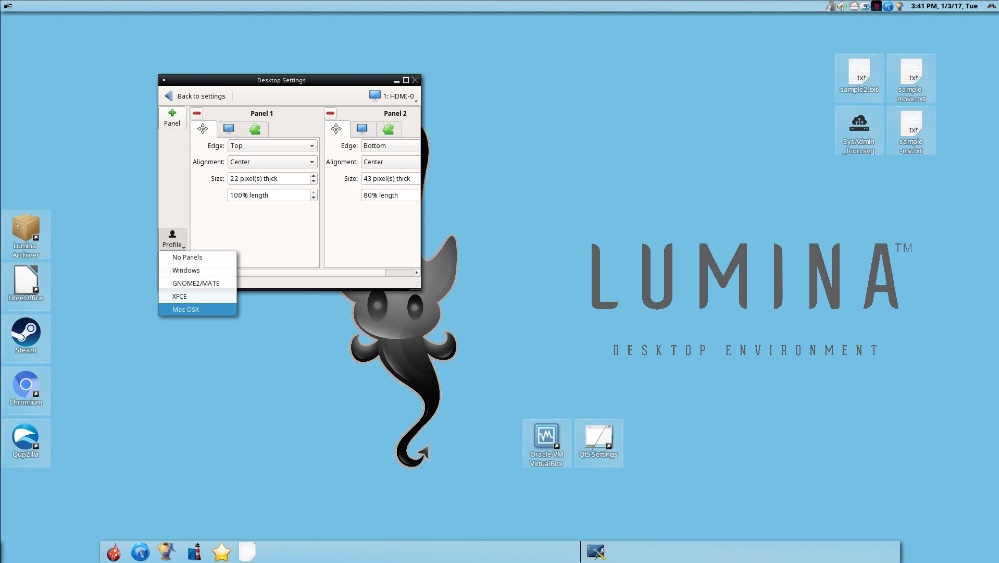 Lumina 提供了一个简单而轻巧的桌面环境。屏幕底部有一个面板,它的左侧是应用菜单,中间是任务栏,右边是系统托盘。桌面上有图标,可以快速访问常见的应用和路径。