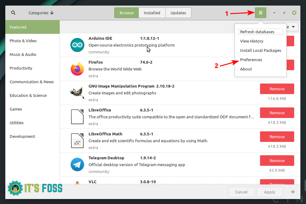 进入 Pamac 后,请进入如下所示的 首选项 preferences 。