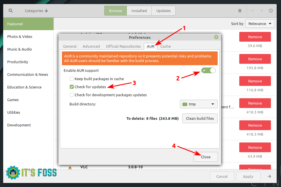 在首选项对话框中,进入 “AUR” 选项卡,启用 AUR 支持,启用检查更新,并关闭对话框。