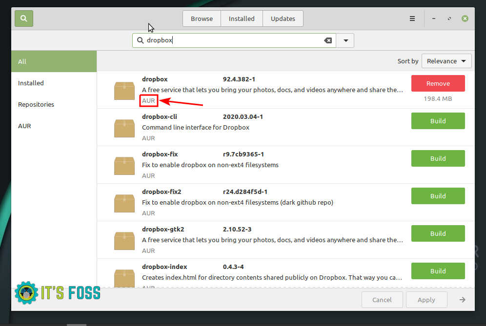 现在,你可以搜索软件包,并且可以通过软件包描述下的标签来识别属于 AUR 的软件包。