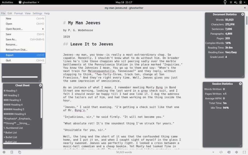 要创建你的电子书,打开 ghostwriter,开始编写你的文档。如果你以前使用过 Markdown,你可能习惯于在文档的“标题 1”的前面放置一个 # 符号来作为标题。像这样: # My Man Jeeves。然而,pandoc 将不会识别其为标题,并将在你的电子书的顶部放置一个一个大的 “UNTITLED” 。相反地在你的标题前放置一个 % 来作为标题。例如,% My Man Jeeves 。章节应该被格式为“标题 2”,例如,## Leave It to Jeeves。如果你有子章节,使用“标题 3”(###)。