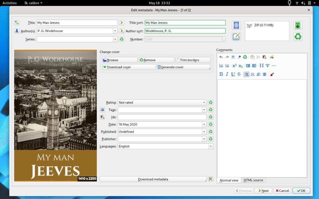 在文件导入后,通过单击 “编辑元数据” 按钮来编辑文件的元数据。在这里你可以填写书的标题和作者的姓名。你也可以上传一个封面图片(如果你有的话),或者 calibre 将为你生成一个封面。