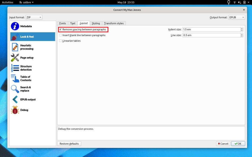 接下来,单击 “转换书籍” 按钮。在新的对话框中,选择 “界面与外观” 部分的 “布局” 标签页。勾选 “删除段间空行” 选项。这将更加严格地缩进每一段的内容。