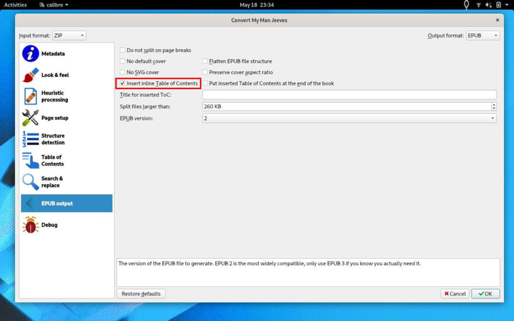 接下来,告诉 calibre 包含内容目录。选择 “输出 EPUB” 部分并勾选 “插入内联目录”。单击“确定“ 创建 epub 文件。