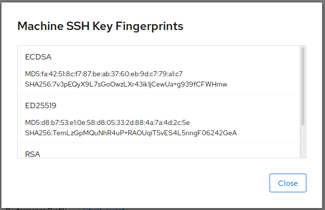 由于安全是系统管理员的关键因素,Cockpit 现在有了查看机器 MD5 和 SHA256 密钥指纹的选项。点击 “显示指纹” 选项可以显示服务器的 ECDSA、ED25519 和 RSA 指纹密钥。