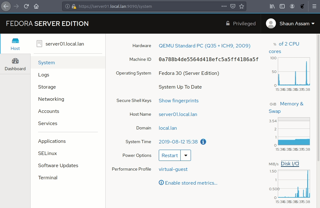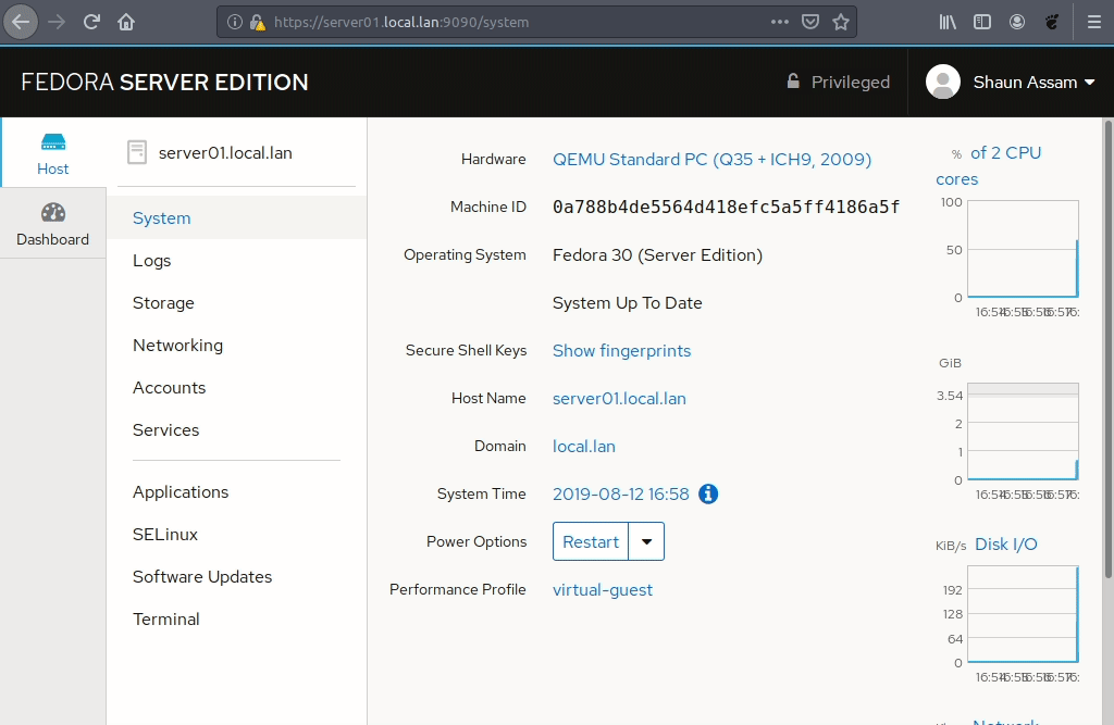 “Headless Management” 组包括了仪表盘模块(cockpit-dashboard)。它以实时图表的形式提供了 CPU、内存、网络和磁盘性能的概览。远程服务器也可以通过同一界面进行添加和管理。