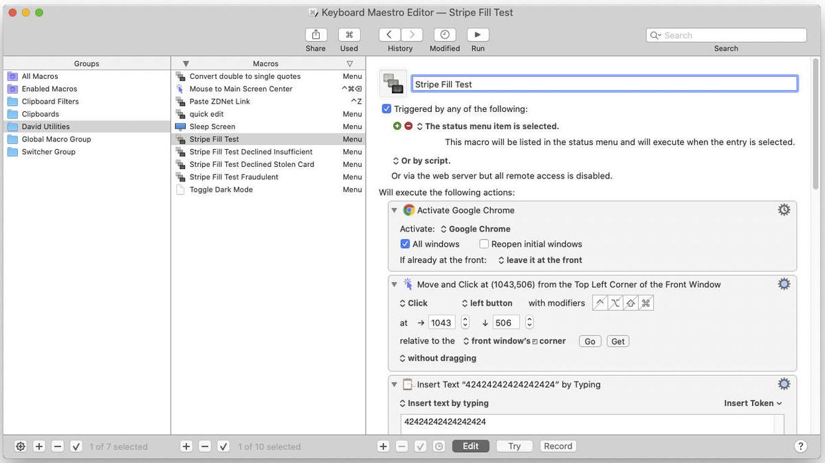 我们来谈谈这个问题。在为我的捐赠插件开发 Stripe 支付网关时,我必须发起测试支付,大概有上千次。在我编码、测试和调试的过程中,我不得不用相同的测试数据填写相同的信用卡字段,一遍又一遍。Keyboard Maestro 中的一个简单的脚本为我完成了所有这些工作。我不需要为每一次测试手工填写数据,而是让 Keyboard Maestro 帮我完成。