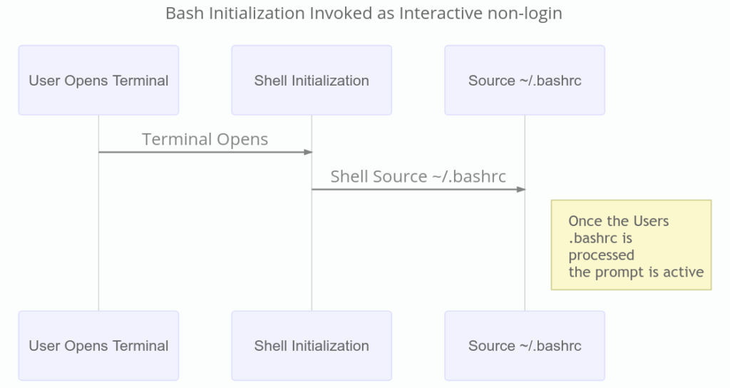 当登录 shell 正常退出时,如果 ~/.bash_logout 和 /etc/bash_logout 存在,它们会被调用。下一幅图展示了 Bash 作为交互式 shell 启动时的过程。例如,当用户从桌面环境打开终端模拟器时,会按照以下顺序进行。