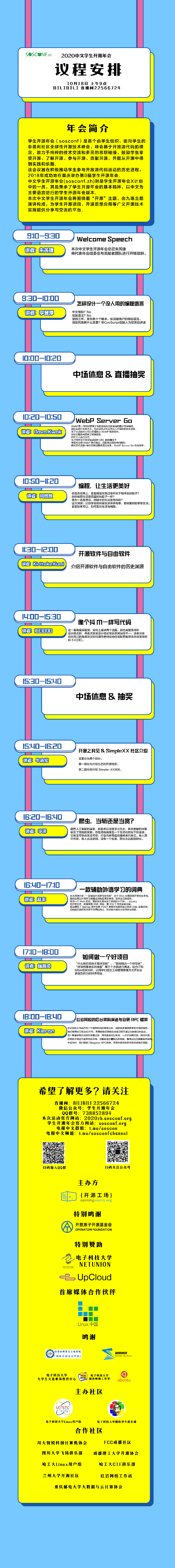本次中文学生开源年会将围绕着“开源”主题,由九场主题演讲构成,为学生开源项目、开源思想应用等广义开源技术实践提供分享与交流的平台。