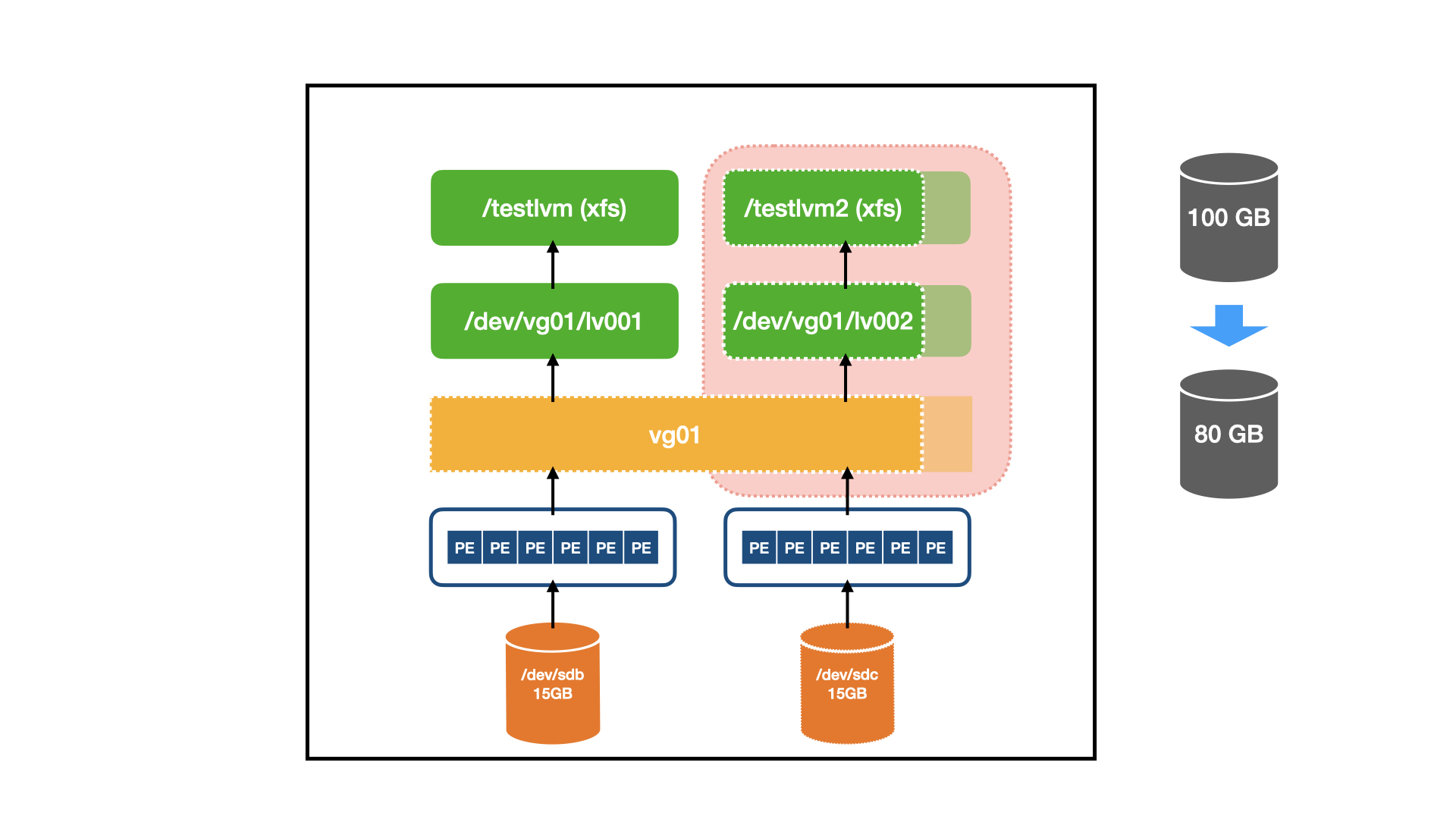 下面的命令将把 testlvm1 文件系统从 100GB 缩小到 80GB