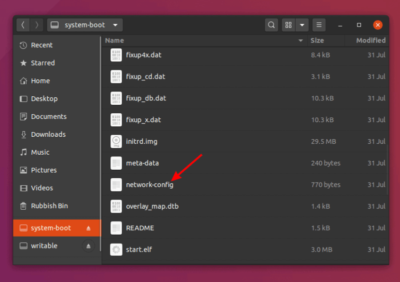 SD 卡仍然插入读卡器中,打开文件管理器,找到卡上的 “system-boot” 分区。