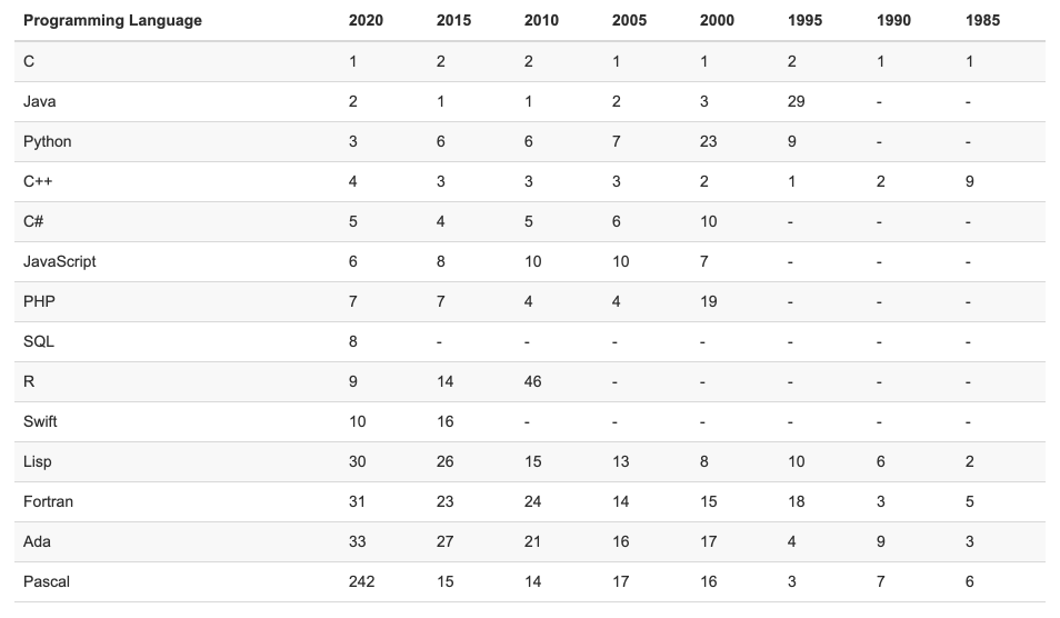 历年前 10 名编程语言的年度平均排名