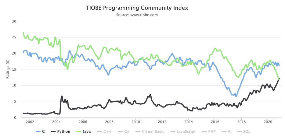 Tiobe 这么多年以来发布的指数中,29 岁的 Python 首次超过了 25 岁 Java,成为第二受欢迎的编程语言。