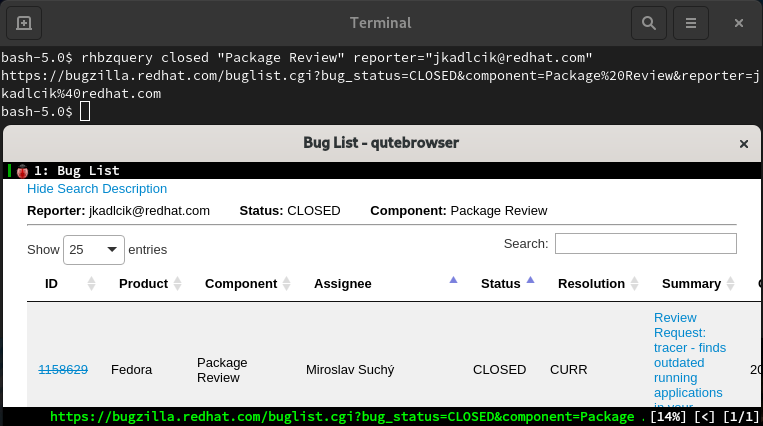 rhbzquery 是一个简单的查询 Fedora Bugzilla 的工具。它提供了一个指定搜索查询的界面,但它并不在命令行中列出结果,而是由 rhbzquery 生成 Bugzilla 的 URL,并在浏览器中打开。