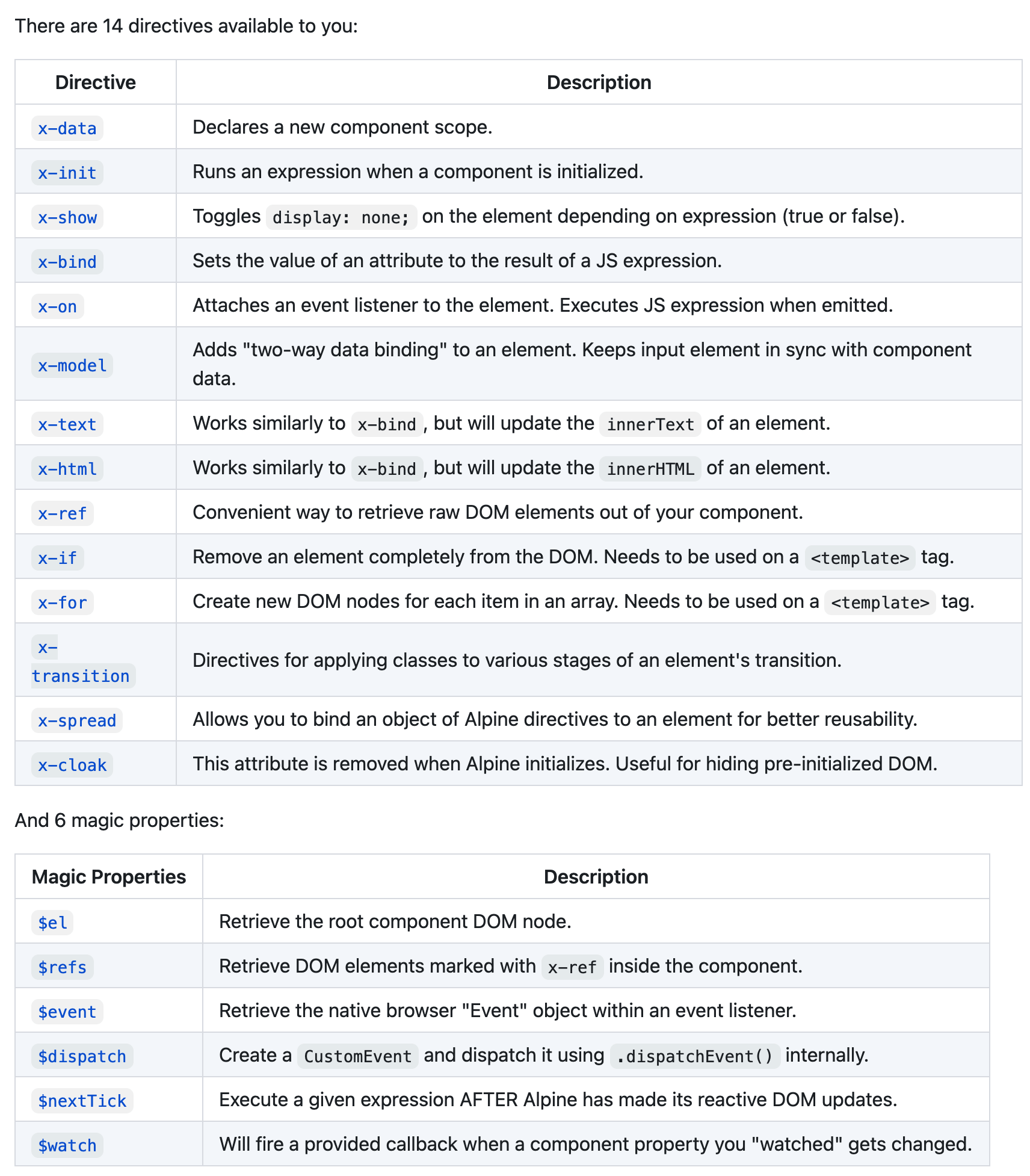 举个例子来说,假设你想要在 Vue/React 中实现双向绑定,你需要将你的代码放在模板中或者转换为 JSX 来获取相应的双向绑定的能力。但在 Alpine.js 中,你需要做的仅仅是在你需要绑定的地方加入 x-model=xxx 来实现绑定,十分简单。