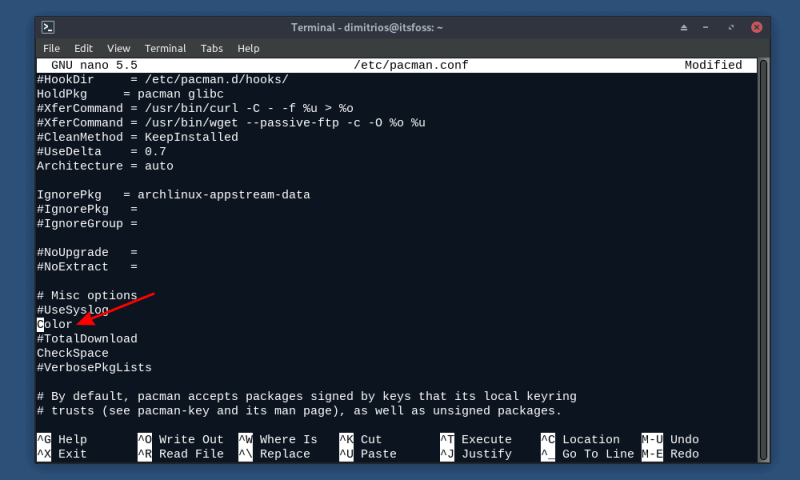 要在 paru 中启用颜色,你必须先在 pacman 中启用它。所有的配置文件都在 /etc 目录下。在此例中,我使用 Nano 文本编辑器,但是,你可以选择使用任何基于终端的文本编辑器。