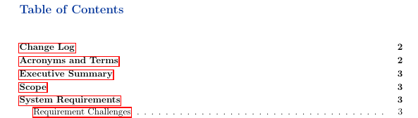 \hypersetup{ pdfborder = {0 0 0}} % removes the red boarder from the table of content