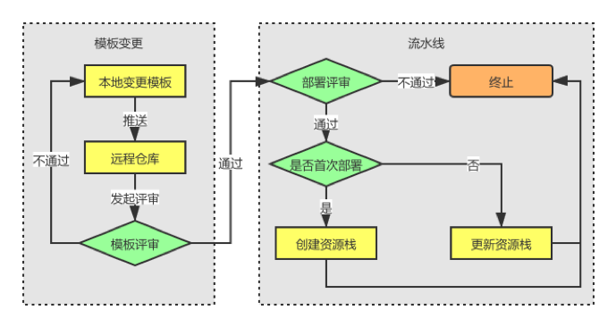 - 若评审不通过,则修改模板后重新发起评审;若评审通过,则自动触发流水线;