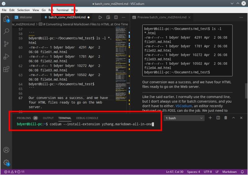 就像我们前面说的那样,我通常使用命令行,但是对于批量转换,我不会使用命令行,你也不必。VSCode 或 VSCodium 可以完成批量操作。你只需要安装一个 Markdown-All-in-One 扩展,就可以在一次运行中转换多个 Markdown 文件。