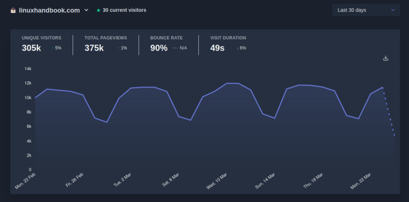 如果你不是超级痴迷于数据,只是想快速了解网站的表现,Plausible 是一个不错的选择。我喜欢它,因为它是轻量级的,而且遵守隐私。这也是我在 Linux Handbook,我们 教授 Linux 服务器相关的门户网站 上使用它的主要原因。