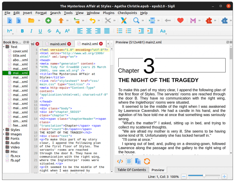 Sigil 不是你可以直接输入新书章节的 所见即所得 类型的编辑器。由于 EPUB 依赖于 XML,因此它专注于代码。可以将其视为用于 EPUB 文件的 类似于 VS Code 的代码编辑器。出于这个原因,你应该使用一些其他 开源写作工具,以 epub 格式导出你的文件(如果可能的话),然后在 Sigil 中编辑它。