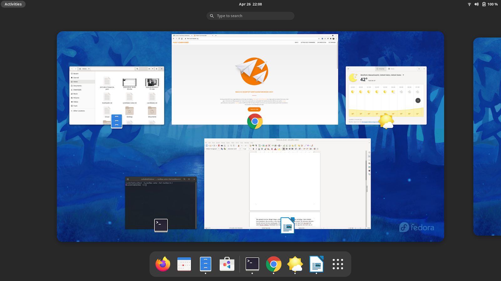 当你登录到 GNOME 40 桌面时,首先注意到的就是你现在会被直接带到一个重新设计的概览屏幕。你会注意到仪表盘已经移到了屏幕的底部。GNOME 40 的另一个主要变化是虚拟工作空间现在是水平摆放的,这使 GNOME 与其他大多数桌面更加一致,因此应该使新用户更容易适应 GNOME 和 Fedora。