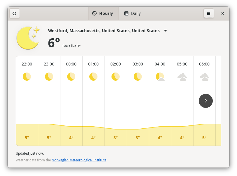 GNOME “天气”为这个版本进行了重新设计,具有两个视图,一个是未来 48 小时的小时预报,另一个是未来 10 天的每日预报。