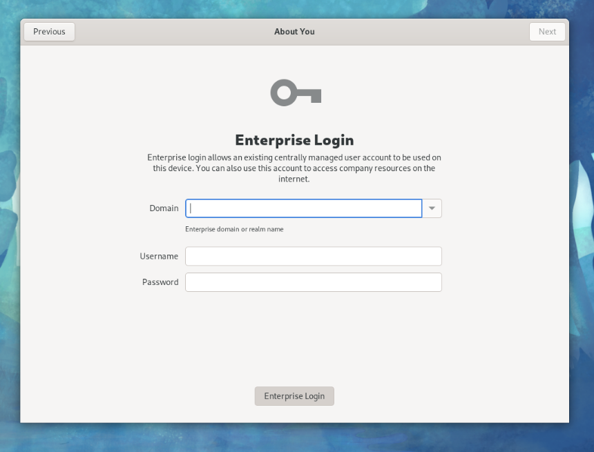 要加入域网络,你需要域管理员的权限才能添加计算机。可以通过在域凭据上设置特殊权限或代表你对该计算机进行预配置。Fedora Linux 有一个在安装时配置机器的选项,叫做 企业登录 Enterprise Login 。如果你的计算机网络自动配置为企业域网络,那么你可以直接使用域凭据登录。
