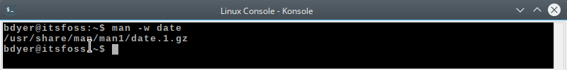 你可能想知道是否有一个与 whereis 相当的 man 命令。没有一个命令可以告诉你可执行文件的位置,但有一个开关可以告诉你手册页的位置。在这个例子中使用 date 命令,如果我们输入: