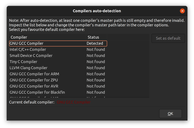 在我的例子中,我的 Ubuntu 系统上已经安装了 gcc,Code Blocks 很好地识别了它。