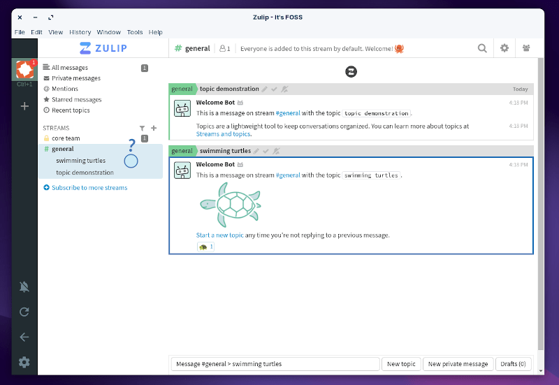 与 Slack 中的频道相比,Zulip 聊天添加了话题(类似标签),以快速过滤与你有关的对话。