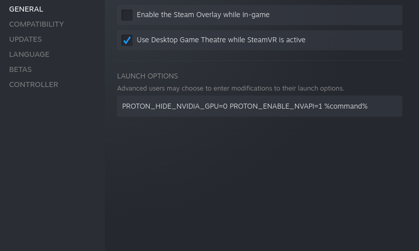 最后,你需要在“ 启动选项 Launch Options ”中插入命令:PROTON_HIDE_NVIDIA_GPU=0 PROTON_ENABLE_NVAPI=1 %command% 。