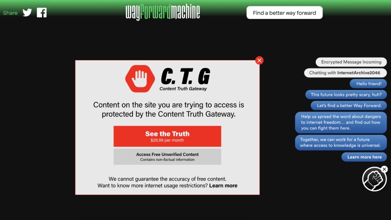 以提供“网站时光机”著称的互联网档案馆最近开发了一个未来时光机: Wayforward Machine ,它可以直接“快进”到 2046 年。当然,这只是一个对当前充斥这广告、隐私盗取的互联网的讽刺。