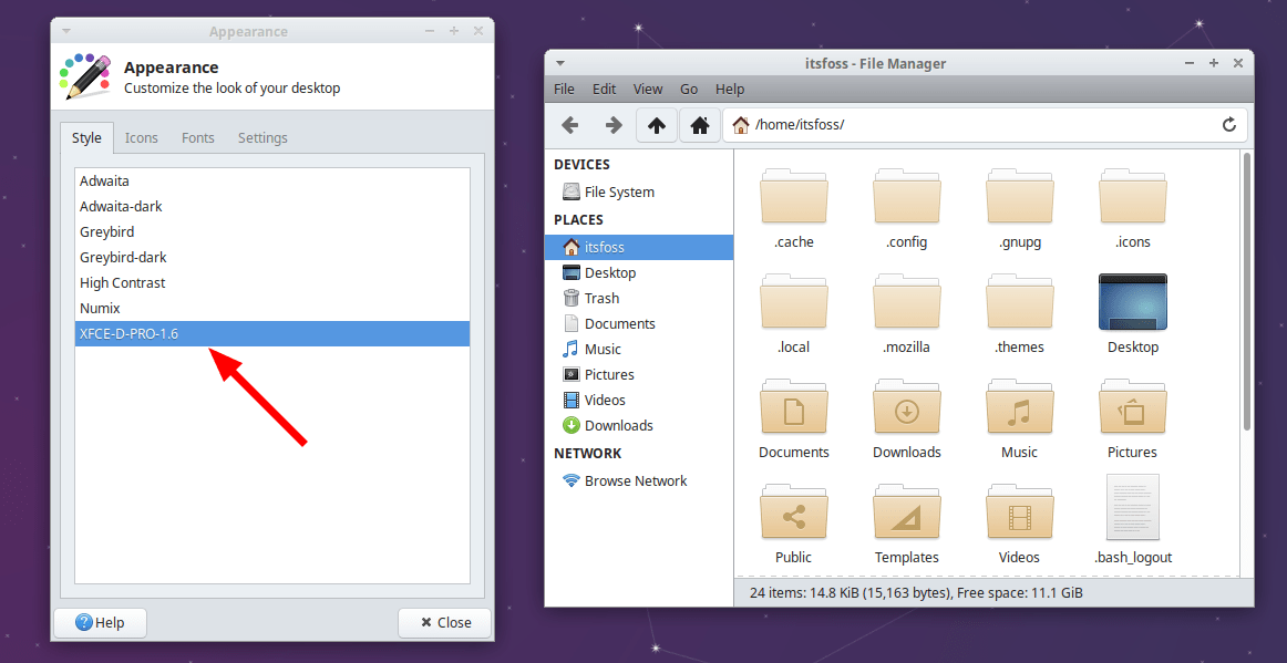 为了向你展示区别,我把默认的 Xubuntu 主题改为 adwaita-dark,你可以在这里看到: