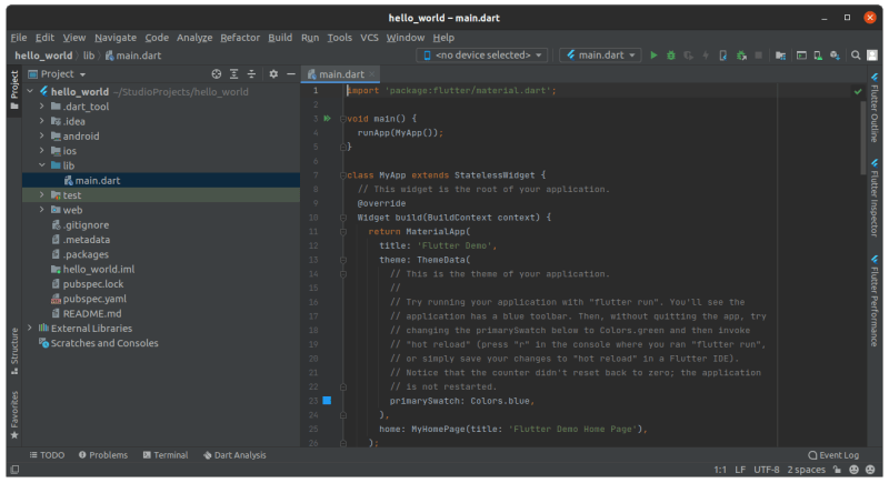 你可以如此快速地创建一个 Flutter 项目,真是不可思议。跟你的 Hello World 项目打个招呼吧。
