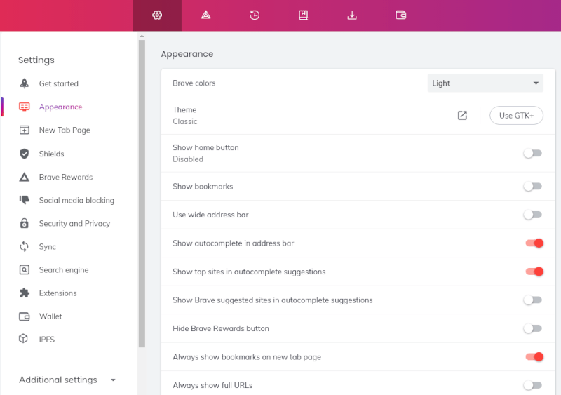 而对于 Brave,它并不能开箱即用地适应你的系统配色方案。但是,你可以在它的外观设置里启用 GTK 主题。
