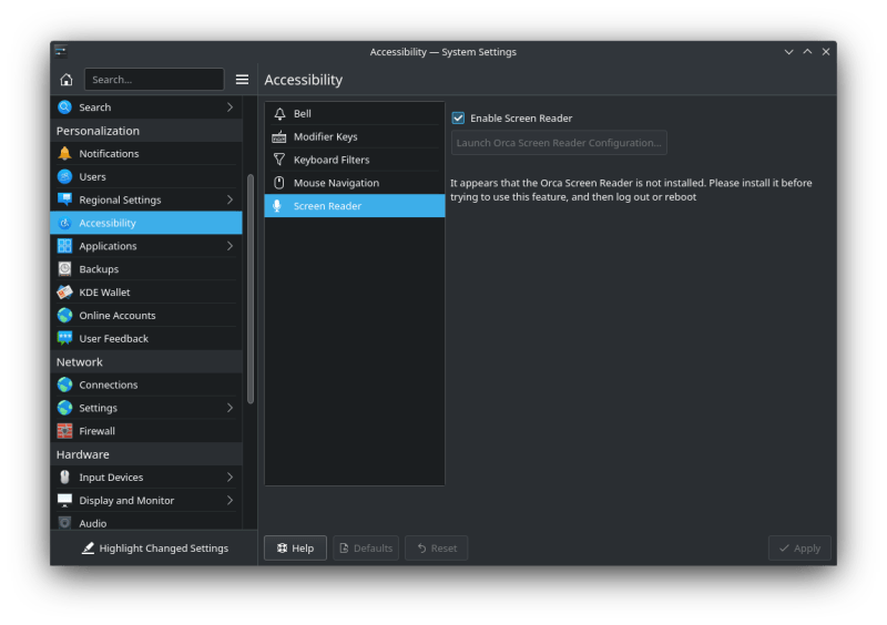 虽然 KDE 在几个方面做得很好,但增强桌面无障碍的可用能力非常有限(比如没有开箱即用的屏幕阅读器)。