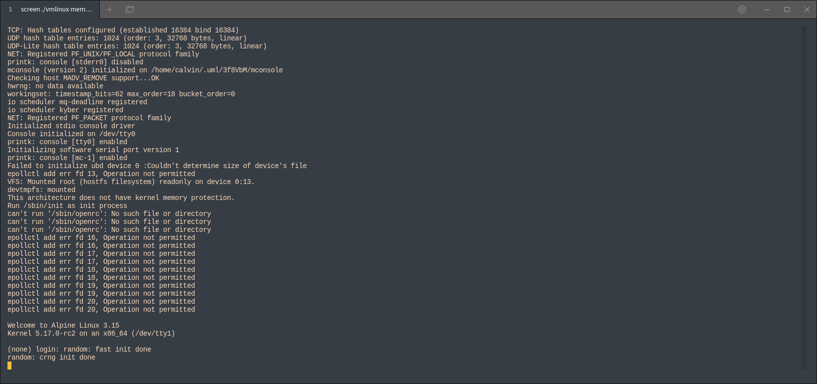 $ screen ./vmlinux mem=1G root=/dev/root rootfstype=hostfs hostfs=./rootfs con=null con0=null,fd:2 con1=fd:0,fd:1