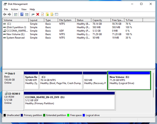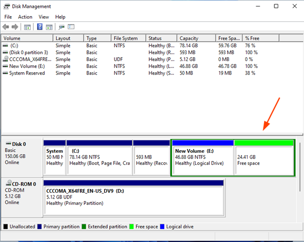 在缩小磁盘空间后,它将显示为 未分配 Unallocated 或 可用空间 Free Space ,如图所示。