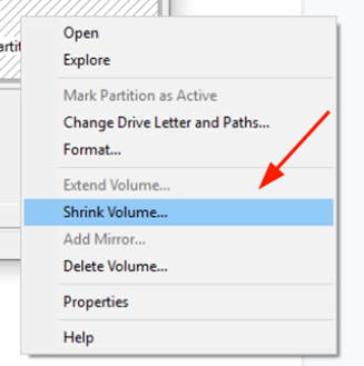 因此,在你想要压缩的磁盘驱动器卷上点击鼠标右键,并在弹出的菜单中选择 压缩卷 Shrink 选项。