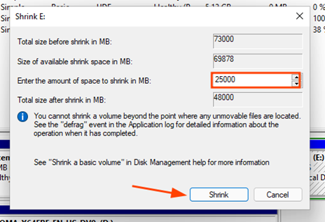 将会出现一个弹出对话框,如下所示。具体指定压缩的控件大小(以 MB 为单位),并单击 压缩卷 Shrink 。