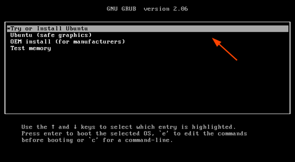 在第一个屏幕中,你将得到如图所示的 GRUB 菜单。选择第一个选项 尝试或安装 Ubuntu Try or Install Ubuntu ,并按下 回车键 ENTER 按键。
